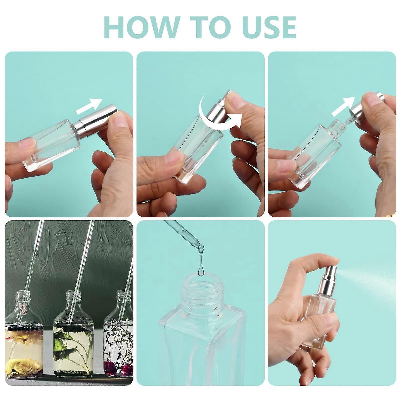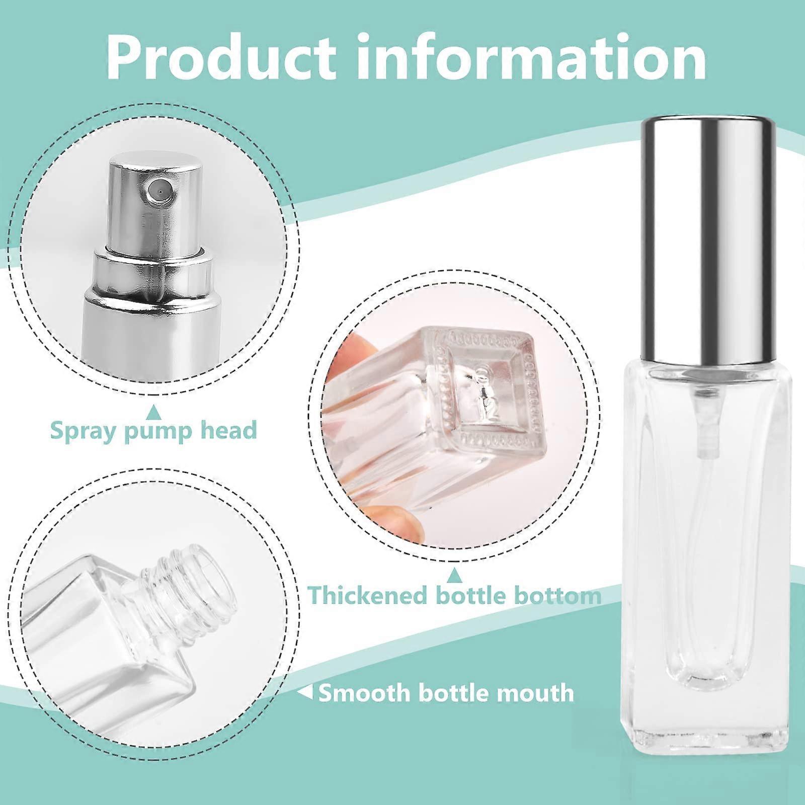 [Durable and Secure]: These refillable travel perfume spray bottles feature thickened glass bottles that are highly resistant to breakage. The threaded mouth design ensures easy opening and provides a strong seal, preventing any leakage or spills. [Timeless Elegance]: The simple and transparent style of these perfume decanters guarantee that your perfume will retain its original scent and won't evaporate over an extended period, ensuring long-lasting enjoyment of your favorite fragrances. [Fine Mist Sprayer]: The small perfume refill bottles are equipped with a fine spray mechanism that produces a delicate and even mist. This feature ensures a precise application, allowing you to spritz your perfume evenly on your skin or clothing. [Portable and Convenient]: With a 6ml capacity and lightweight construction, these travel perfume atomisers are perfect for on-the-go use. Whether you carry it in your purse, pocket, or luggage, you'll always have your favorite fragrance at hand, ready to refresh and uplift your senses. [Versatile and Multi-Purpose]: These portable perfume refillable bottles for travel can hold a variety of liquids, including essential oils, perfumes, men's aftershave, face and body sprays, colognes, toners, rose water, and more. Their compatibility with various water-based liquids makes them a versatile accessory for your fragrance collection.